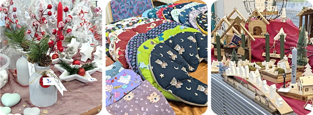 Parallel zur Buchausstellung präsentieren kreative Hobbykünstler aus der Region ihre handgefertigten Schätze. Zu entdecken gibt es liebevoll gestrickte Accessoires, genähte Taschen und Babykleidung, warme Filzhüte sowie wohltuende Wärmekissen. Für alle, die Dekorationen lieben, warten kunstvoll gestaltete Holzschilder, stimmungsvolle Holzdeko für draußen und feine Objekte aus Raysin – alles Unikate, die mit viel Liebe zum Detail gefertigt wurden und perfekte Geschenkideen für die bevorstehende Adventszeit bieten.